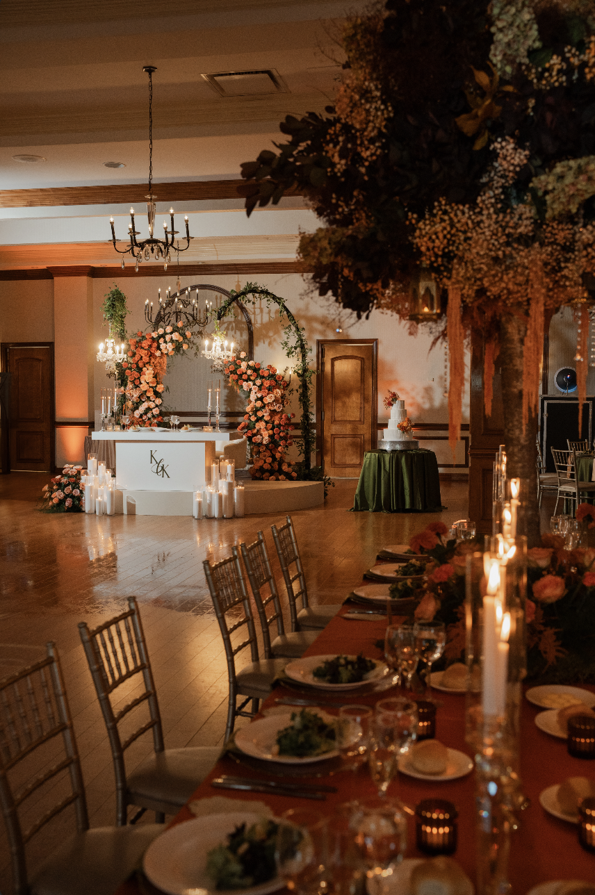 Kendra and Kevin chose to customize their space with the addition of an entryway and repurposed the floral arrangement from their ceremony to accent the dais, giving the ballroom a whimsical forest feel.